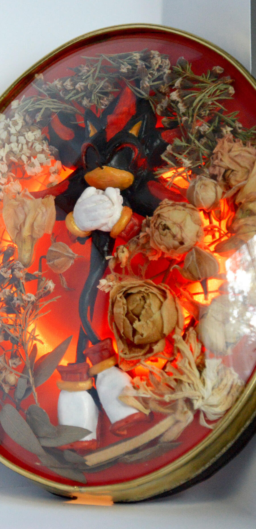A hand-made figure of Shadow the Hedgehog sleeping flat with his hands lying on his chest, one leg lightly rise up. He is surrounded by dry flowers, led light in a shape of a circle behind his back reviling his logo. The whole composition closed under a oval bubble glass, supported by a metal frame.The glass and the metal frame are ordered locally from other professionals.